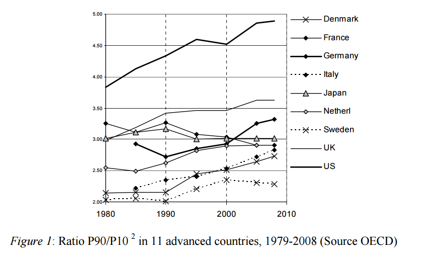 下表是经合组织的统计数据,表中的国家中大部分技能劳动者和无技能劳动者的工资差别在近30年间都有上升趋势。注意,这里的技能劳动者不是说熟练技工,而是政企管理者,金融从业者, IT从业者等高收入群体。