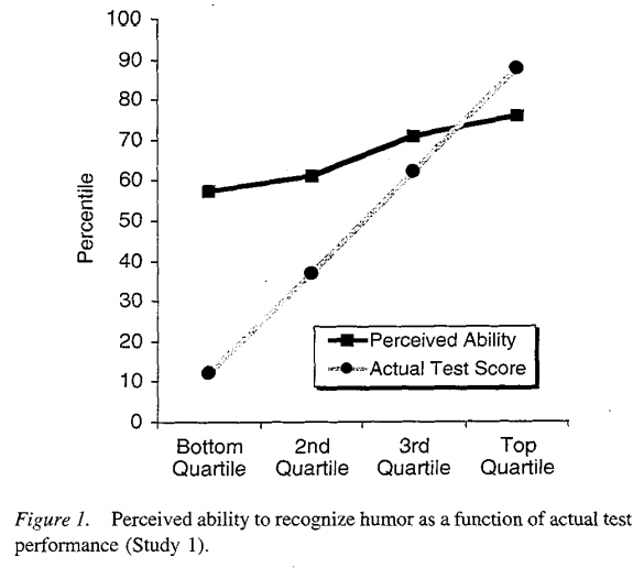 你是不是觉得自己幽默有趣?不,你并没有。下图中的虚线部分是人们的实际幽默感,实线部分是人们对自己的感觉。你看,大多数人的自我感觉比实际结果好,而且越无趣的人自我认知的偏差越大。只有当你真的很幽默的时候,你才可能低估自己的幽默,比如我在看到这篇论文之后,就常常觉得自己好像没有那么有趣。
