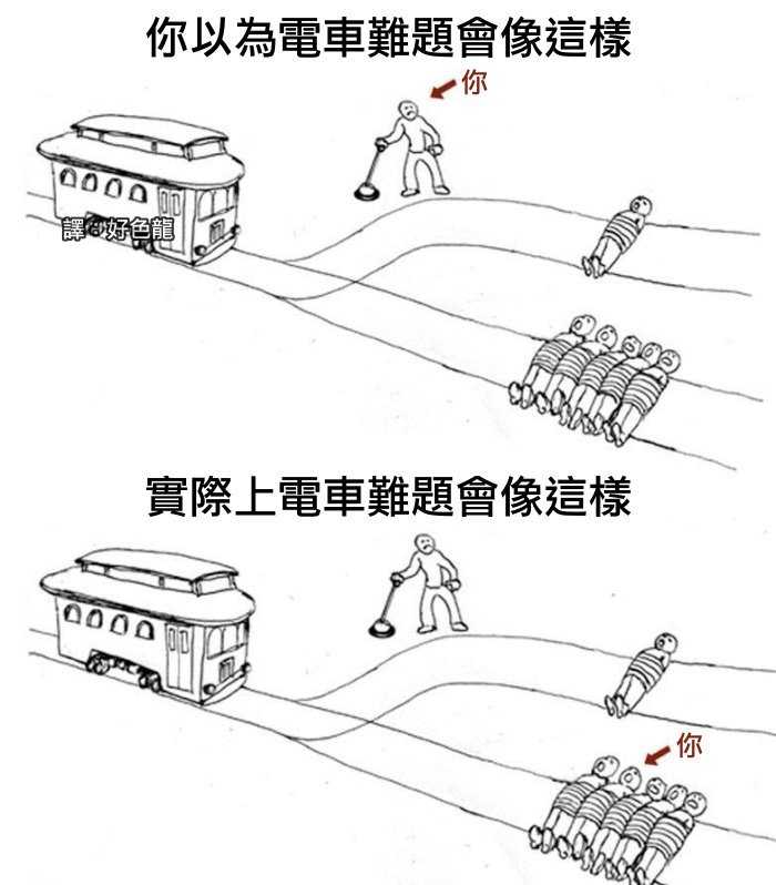斜月: 电车正向五个人驶去,如果让车改变方向,则只会死一个人而你 只是恰好拎着马桶搋子路过而已 👍🏽1 💭N/A IP 🕐2019-03-19 19:22:54