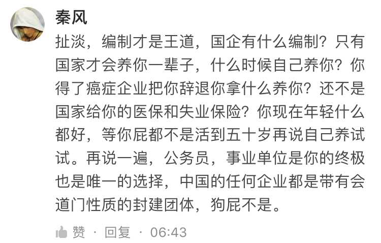 夜郎天子: 5年后的今天,劳动力市场萎靡不振,民企倒闭一堆,国企更受欢迎了[尴尬] @王子君 👍🏽5 💭N/A IP 🕐2021-08-07 10:03:34