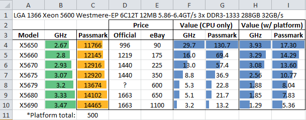 这个其实最无聊,花费时间不少,学到的很有限。无非就是逛eBay逛Newegg看看货看看价格。为了找到理想的机箱和散热器,我几乎看遍了市场上现有和曾有的产品。为了买到性价比最高的1366至强,我做了下面这种图表。