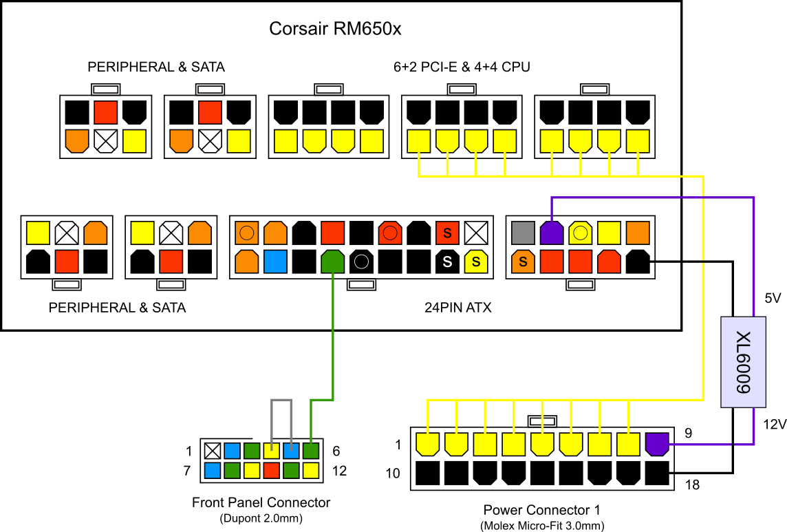 接线方案设计!如上所述,因为服务器主板电源线定义的独特,有时我需要自己琢磨定义。我一般用Inkscape来画接线图,不仅赏心悦目,而且还能发出来造福网友。下图是我根据前人经验总结的Dell PowerEdge C8220(就是题图那台“曲率引擎”)裸主板无需整机直接点亮的接线图。