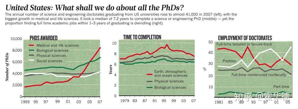 科学博士拿到终身教职的比例持续下滑,工业界也未能完全吸收这些富余人员。生命科学方面问题尤其严峻,这个领域的博士数量增长步伐最大,而制药和生物公司的规模近年已经急剧缩小了。1973年,有55%的生物博士在毕业六年之内就取得了预备终身教职,只有2%去做博士后或者干其他临时教职。到了2006年,仅仅15%在毕业六年之内获得终身教职,有18%只有临时教职。