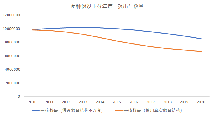 上图是两种不同假设下的分年度一孩出生数量,蓝线的假设是,1990年之后出生的女性的教育结构完全和1990年相同。而橙线使用真实的教育结构给1990年之后的女性赋值。