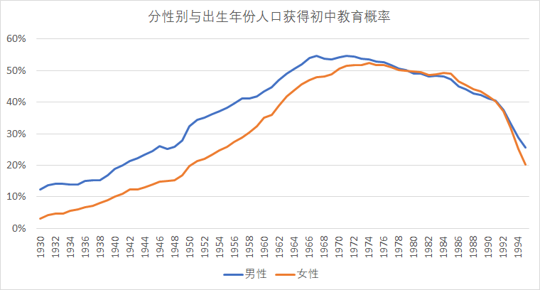 从上图可以看到,1990年到1995年出生的人口,女性的初中学历占比从42%下降到20%,下降了整整22%。而男性从41%下降到26%,仅下降15%。