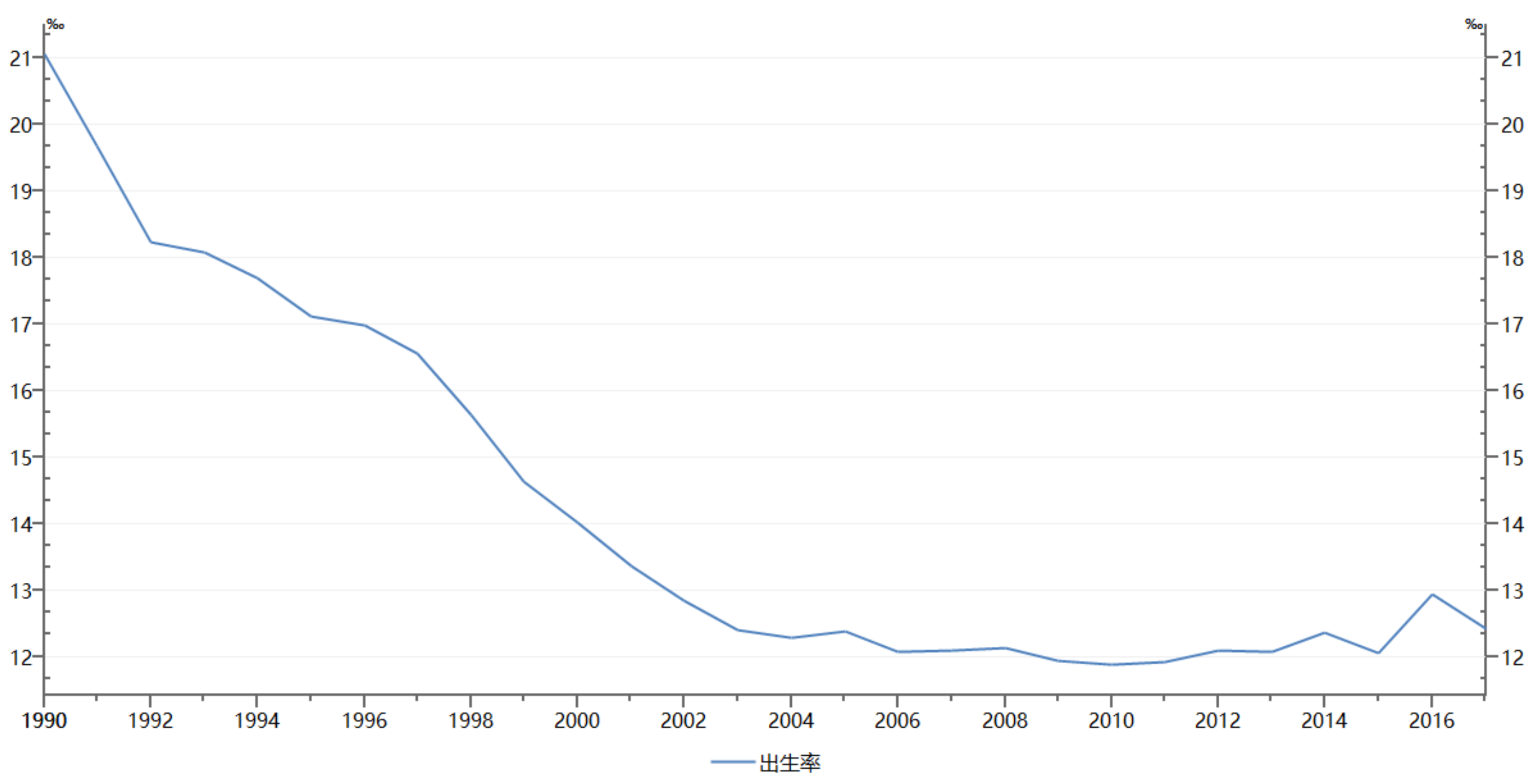 下图列出了从1990年到2017年的历年出生率,在这张图上,试试看把所有重要的所有大事件往线上装,你马上就能发现,比起出生率变动的大趋势,什么经济危机、房价上升,都是连浪花都激不起一朵的小插曲罢了。