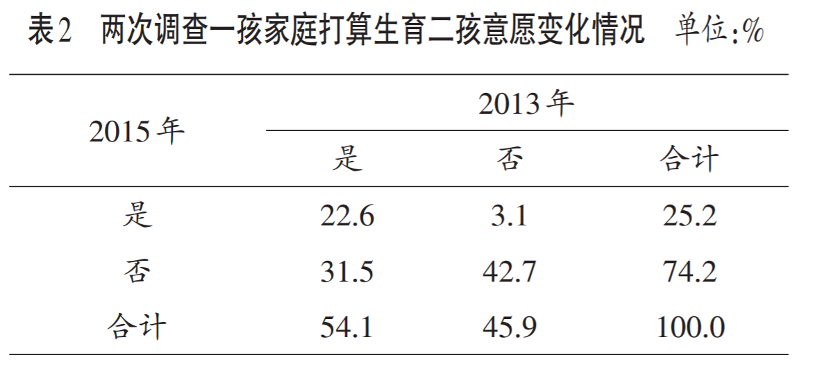 但这个存量数字可能会随着时间的推移缩小,甚至逐渐消除。2013年和2015年时,我国各做了一次生育意愿的追踪调查,做成四格表的话见下图:在2013年想生二孩的一孩家庭,到了2015年再问,四成还想生(22.6/54.1),近六成改口不想生了(31.5/54.1)。