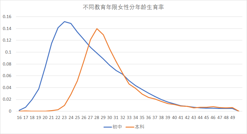 上图是2010年人口普查时初中教育水平和本科教育水平女性的分年龄生育率。可以看到,两者差异非常大。