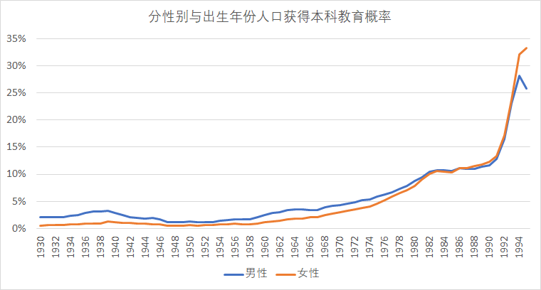 从最新数据看,1998年出生的女性获得本科教育的概率已经稳定在35%左右。