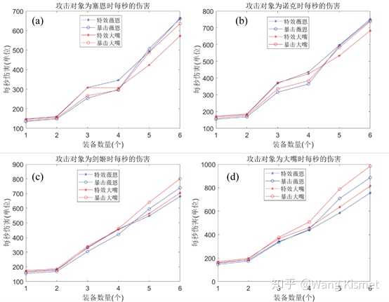 由图d可知,当攻击目标是adc大嘴时,四件套前暴击流输出能力比特效流高。 四件套前薇恩特效、暴击没有差别,大嘴三件套前也没有差别,但四件套时暴击流强于特效流。这是由于adc血量提升不多,大嘴攻速、攻击力高于薇恩,暴击属性提升更明显。