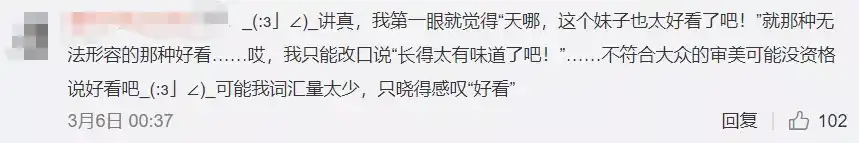 翰林: 专家说这女的好看就好看,大众懂个几把[捂脸] 👍🏽1 💭N/A IP 🕐2019-03-27 13:23:33