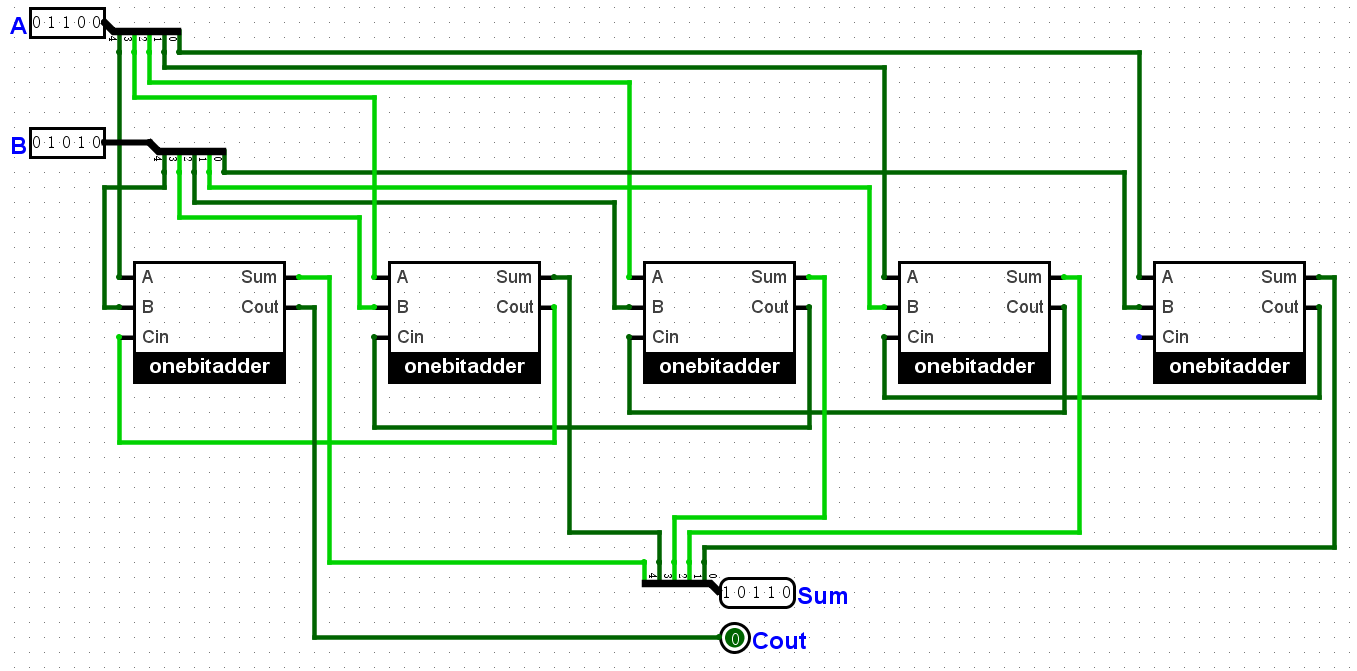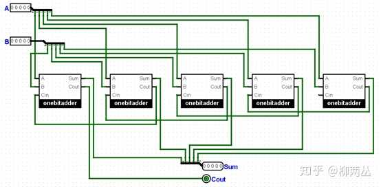看到小刚的设计被完整的实现,小明欣喜:“啊哈哈哈,吾有上将小刚,则霸业可成,汉室可兴啊!”他把黑盒子里的零件全拿了出来,四人忙碌地工作着。很快,他们拥有了5个全加器,基于小红的设计连了起来: