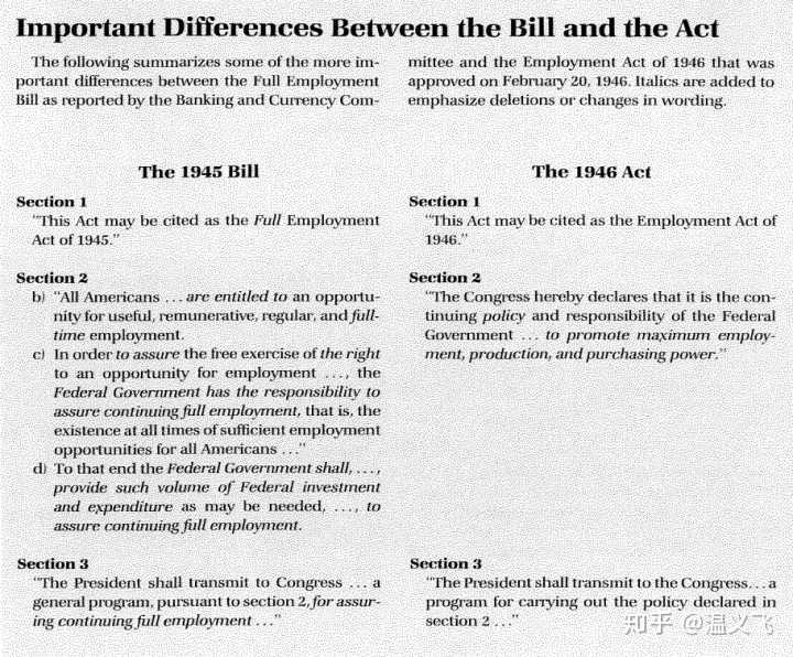 最终,完全体的提案被阉割成了《1946年就业法》,从美国政府有责任安排工作,变成了政府尽量安排工作,一词之差,谬以千里。这一条无疑将改变人类历史进程的提案,终于夭折,但仅仅是最终面世的残缺版本,也已经一举为人类带来二十年的兴旺发展。(下图是两个版本的对比)