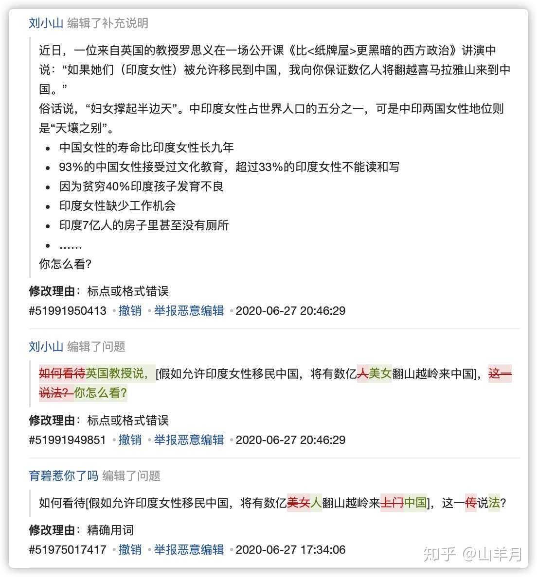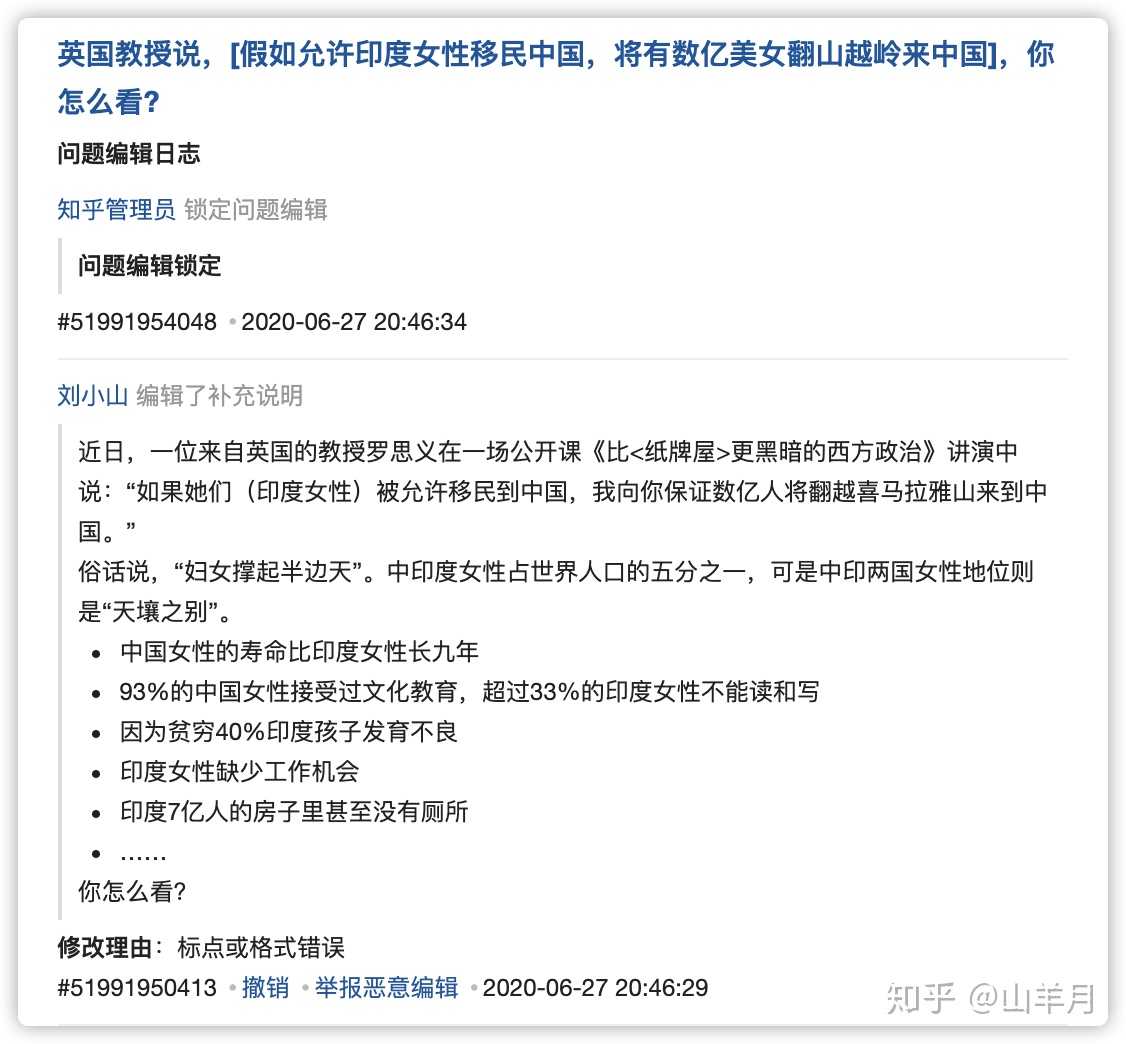 知乎小管家: 感谢各位知友的关注,提问修改错误目前已纠正。帐号「刘小山」在本次编辑中忽视了对提问中涉及信息真实来源的考证,错误地将提问恢复至原始状态,属于不当编辑行为,我们对其帐号的历史编辑行为展开清查,帐号已被永久禁言处理。公共编辑一直是维护知乎内容专业性和规范性的有效手段,我们通过盐值权益将公共编辑权限无差别赋予所有的知乎用户。我们注意到,无差别的权限赋予,对问题的改进有限,且容易产生不必要的恶意编辑和错误编辑行为。我们近期正在对公共编辑进行系列优化,包含:机器自动锁定问题公共编辑策略更新、错误编辑恶意编辑处罚机制优化等,目前还在内测期,优化成熟后会同步各位知友,在此期间中,非常需要优秀公共编辑用户帮助我们及时指正监督发现问题,我们会根据反馈情况进行改进。期待各位优秀的知友与我们一起维护社区良好的讨论氛围。 👍🏽84 💭N/A IP 🕐2020-06-30 13:42:06