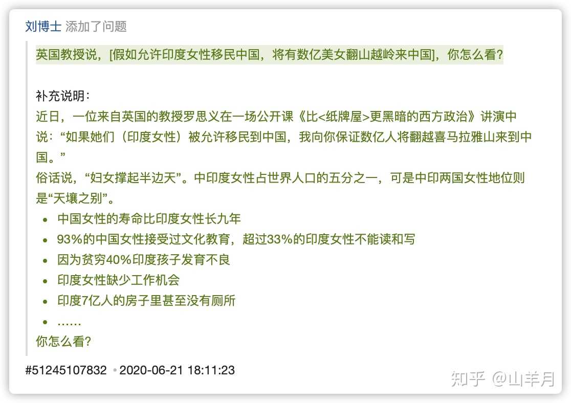 Null: 您好,山羊月,很抱歉您的回答受到了牵连,您回答过的问题「英国教授说,[假如允许印度女性移民中国,将有数亿美女翻山越岭来中国],你怎么看?」因「违反知乎社区管理规定」已被删除。 👍🏽179 💭N/A IP 🕐2020-06-28 11:31:58