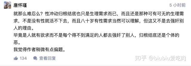 知乎用户nCf7WA: 就那么难忍么?性冲动归根结底也只是生理需求而已,而且还是那种可有可无的生理需求,不是没有性就活不下去,而且八十岁有性需求当然可以理解,但这又不是去强奸别人的理由。毕竟是人就有欲求而不是每个得不到满足的人都去强奸了别人,归根结底还是个体的恶。我觉得作者稍微有点偏题。 👍🏽229 💭N/A IP 🕐2020-07-05 22:33:25