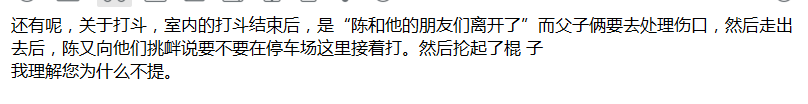 │ └── Kissassay: 机器翻译的吗?什么叫陈挑衅后,然后抡起了棍子?整个过程是现在脱衣舞吧里干了一架,然后陈和朋友离开了,而两白人被保安带去傍边的房间清理伤口。这时候陈的一个朋友返回借厕所,过了一会儿,另外一个朋友进来找之前进来的那个人。这时候两白人出来了,而陈和他另外一个朋友还等在外面。然后陈挑衅说,怎么还打吗?然后两白人就去车上拿了棒球棒,陈2人一看还有拿武器的,赶紧跑。然后两白人在附近街区找了20多分钟,还给钱让另外一个人一起找。最后在一家麦当劳找到的陈,当时陈打算逃跑,但是被儿子抓住,让老爸用棒球棒死命的打。不知道你打过棒球吗?一般用那玩意儿大头就是下死手,没有什么不是故意的。 👍🏽48 💭N/A IP 🕐2020-09-30 16:13:02
