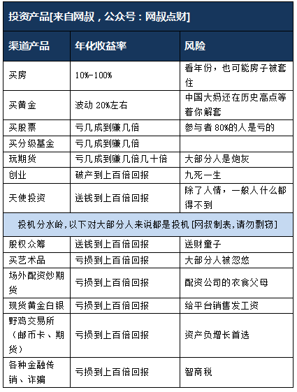 叔见过不少人借此飞黄腾达,屌丝翻身,也有不少人,贸然进入,理财致贫。叔今天作为一个过来人,告诉你们一点宝贵的关于投资理财的人生经验。