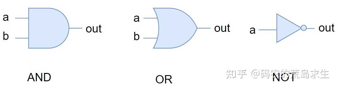 天赋异禀的你搭建的上述组合分别就是:与门,AND Gate、或门,OR gate、非门,NOT gate,用符号表示就是这样: