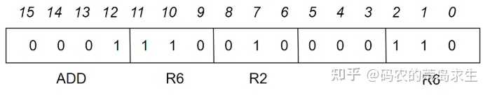 这条指令占据16比特,其中前四个比特告诉CPU这是加法指令,这意味着该CPU的指令集中可以包含2^4也就是16个机器指令,这四个比特位告诉CPU该做什么,剩下的bit告诉CPU该怎么做,也就是把寄存器R6和寄存器R2中的值相加然后写到寄存器R6中。