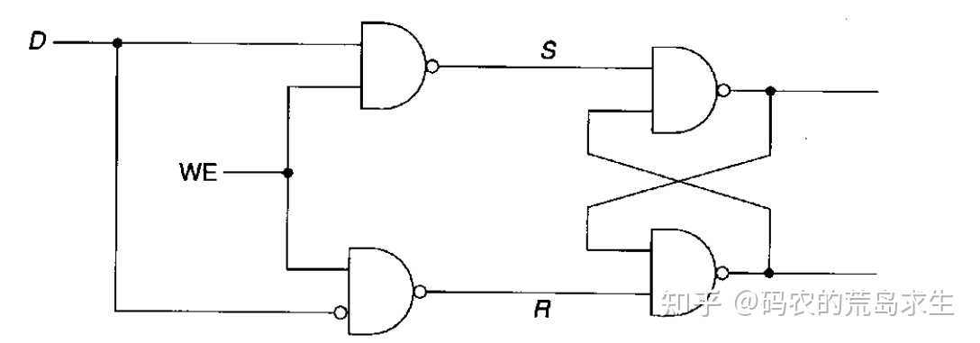 就问你神奇不神奇,电路竟然具备存储信息的能力了 。现在为保存信息你需要同时设置S端和R端,但你的输入是有一个(存储一个bit位嘛),为此你对电路进行了简单的改造: