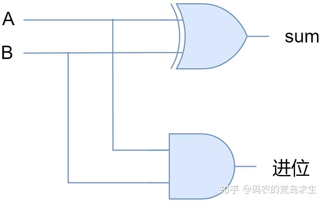 我们说过与或非门是逻辑完备可以生万物,异或逻辑当然不在话下,用一个与门和一个异或门就可以实现二进制加法: