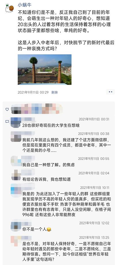 去年我发了朋友圈,说很好奇年轻人都在想啥,本来只是纯粹表达个人感想,没想到好多年龄相仿的人都有同感: