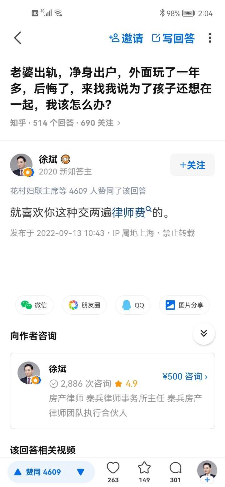 │ └── 知乎用户iooLXl: 这个律师说话有水平的,言简意赅,一针见血,不说废话[飙泪笑] 👍🏽143 💭上海 🕐2022-09-15 19:50:31