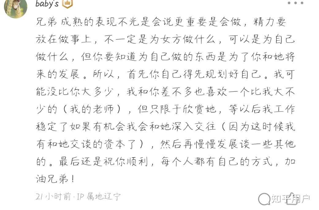│ └── 叮当很修一: 你把这发这里,就是不成熟的体现。因为这点事,你都不懂怎么解决。你还没有看透女人,甚至说人类的本性。站在一个快40岁的男人的角度来看,这只是你人生中一个非常短的经历。如果你成功了,反而会让你最终后悔,如果你失败了,将来的你会一笑而过,庆幸对方没有和你一样犯傻。 👍🏽2 💭四川 🕐2022-09-18 09:42:23