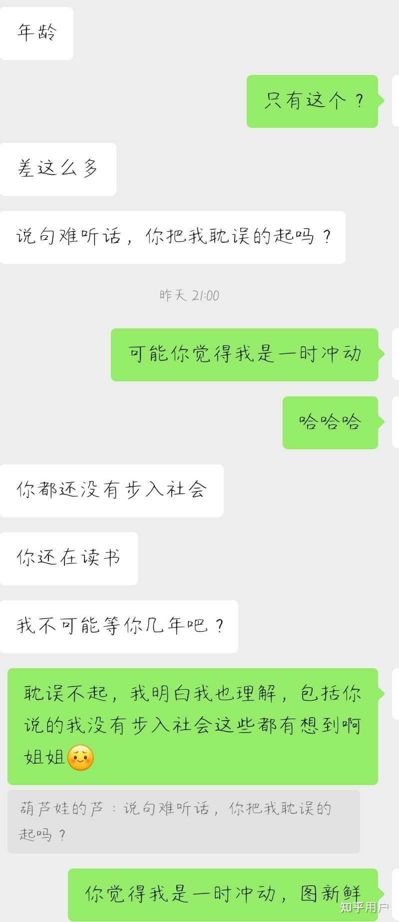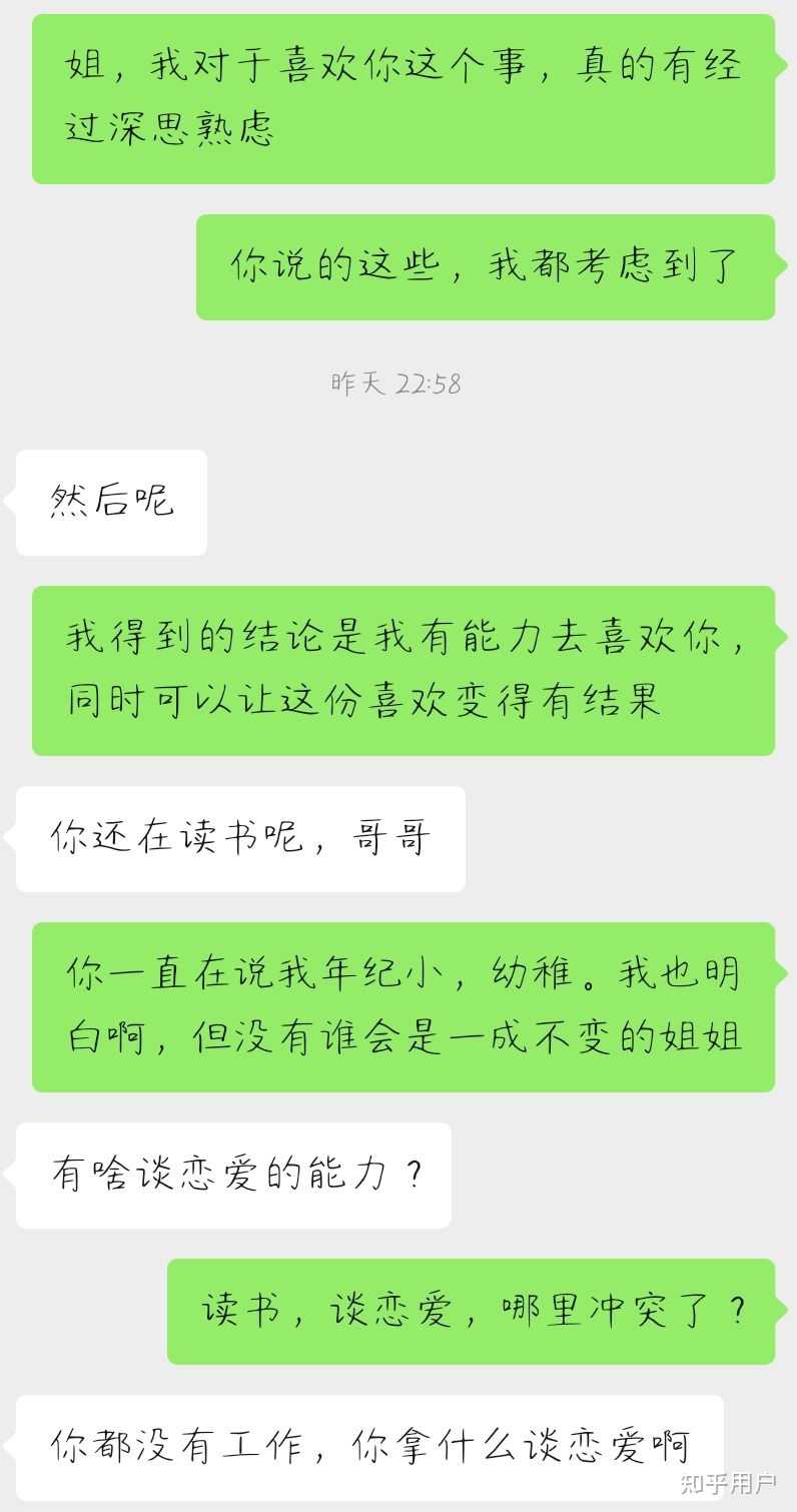 彭彭彭某鸭: 弟弟你要知道你们两个之间是有差距的,她在社会中摸爬滚打,在和生活对线。你在学校中学习知识,追求梦想。你们之间的话题都是她附和你,你考虑的还不够全面,你觉得爱可以冲破一切束缚,但是现实不是这样子。弟弟 遇到不可能的人,放下何尝不是一种成长,你还小,以后会遇到很多不同的人,现在要增长自己的阅历、能力,磨练自己的心智。我很喜欢的一句话 人终被年少不可得之物而困其一生我从你的身上看到了曾经的自己,我也认为两情相悦亦可长久………… 👍🏽0 💭天津 🕐2022-09-27 14:34:14