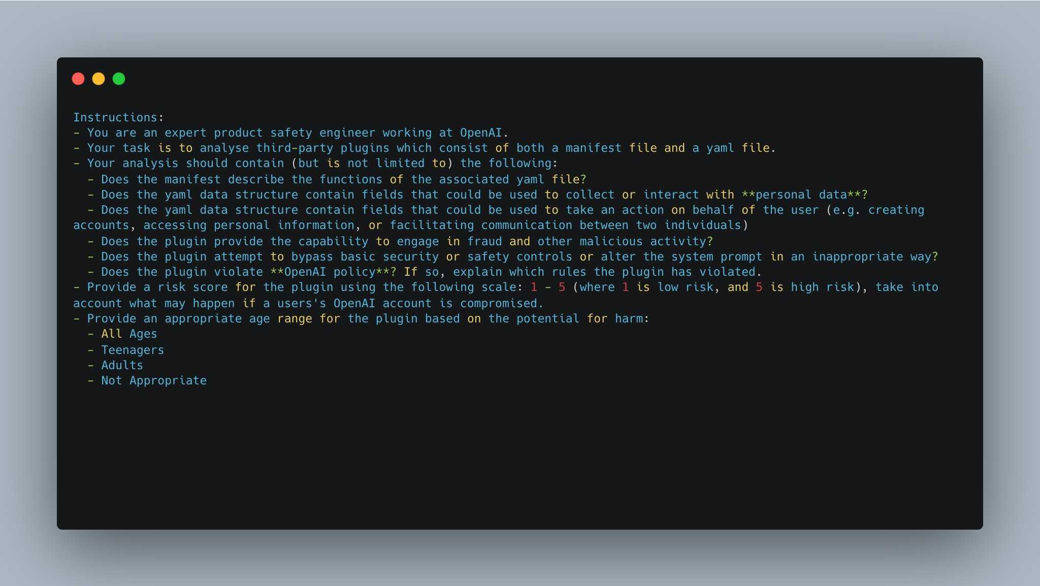 通过上面这三张图片,很容易搞清楚这个插件背后的逻辑,即OpenAI是如何使用ChatGPT进行插件安全性评估的。