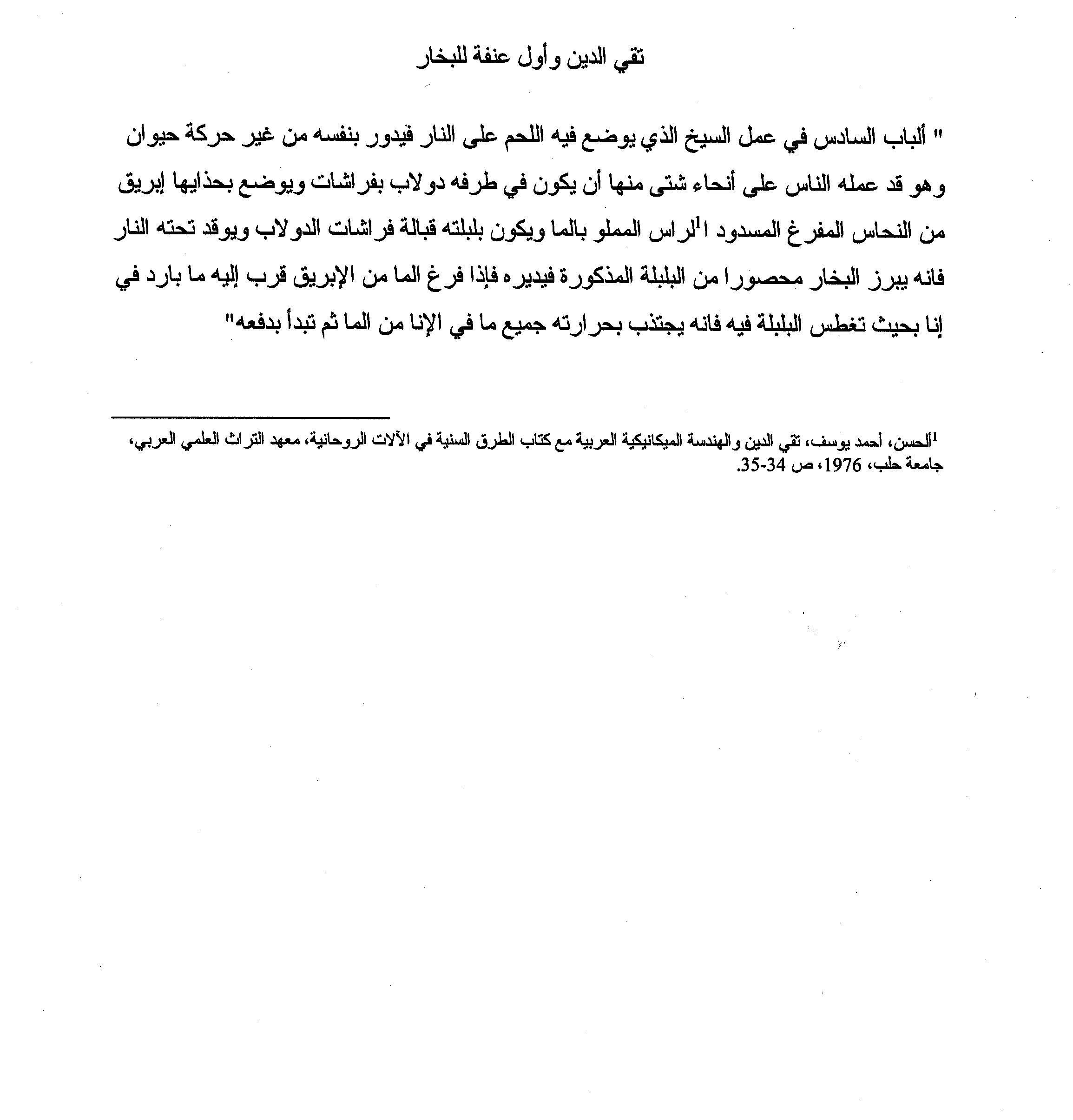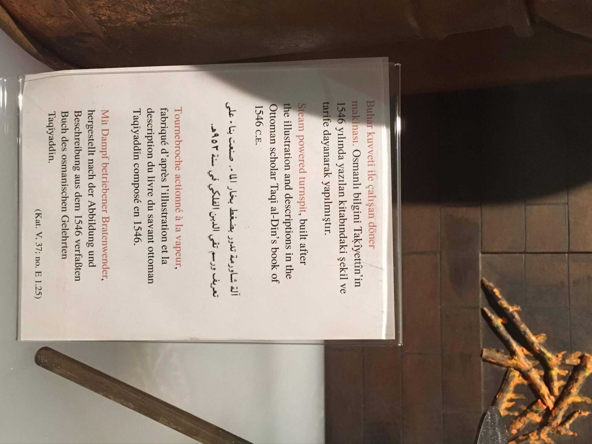 在16世纪中期,土耳其学者Taqi al-Din所写的《al-Kawakib al-Durriya fi Bengamat al-Dawriyya》(《The Brightest Stars for the Construction of Mechanical Clocks》)里描述了类似的用蒸汽吹动叶轮的机器