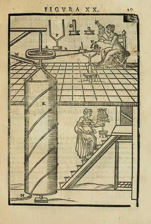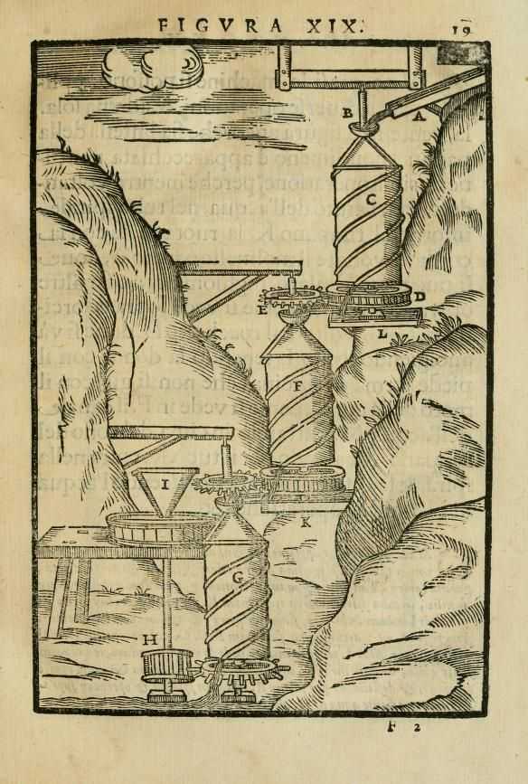 上面三个是一台通过水流与阿基米德螺旋驱动的机器,前两个是磨,第三个是纺纱机