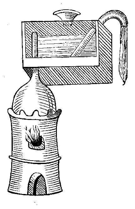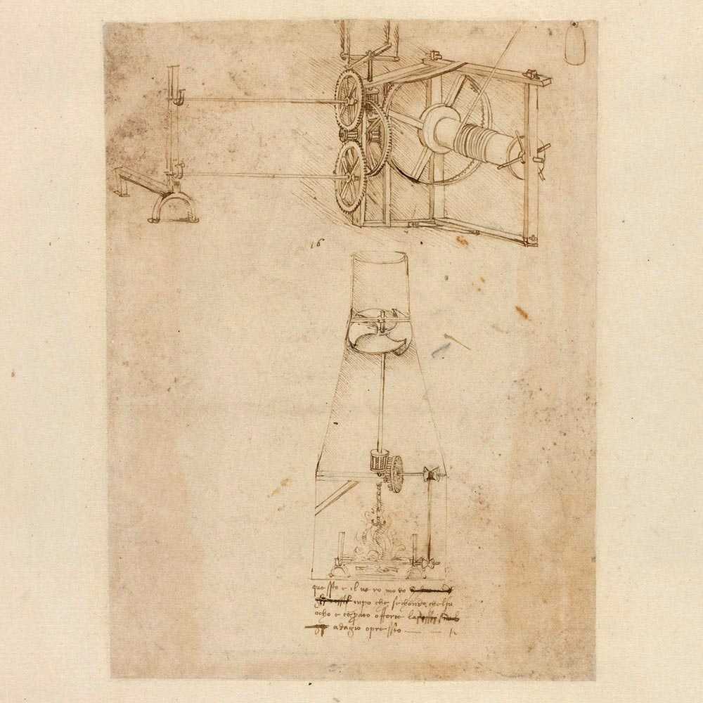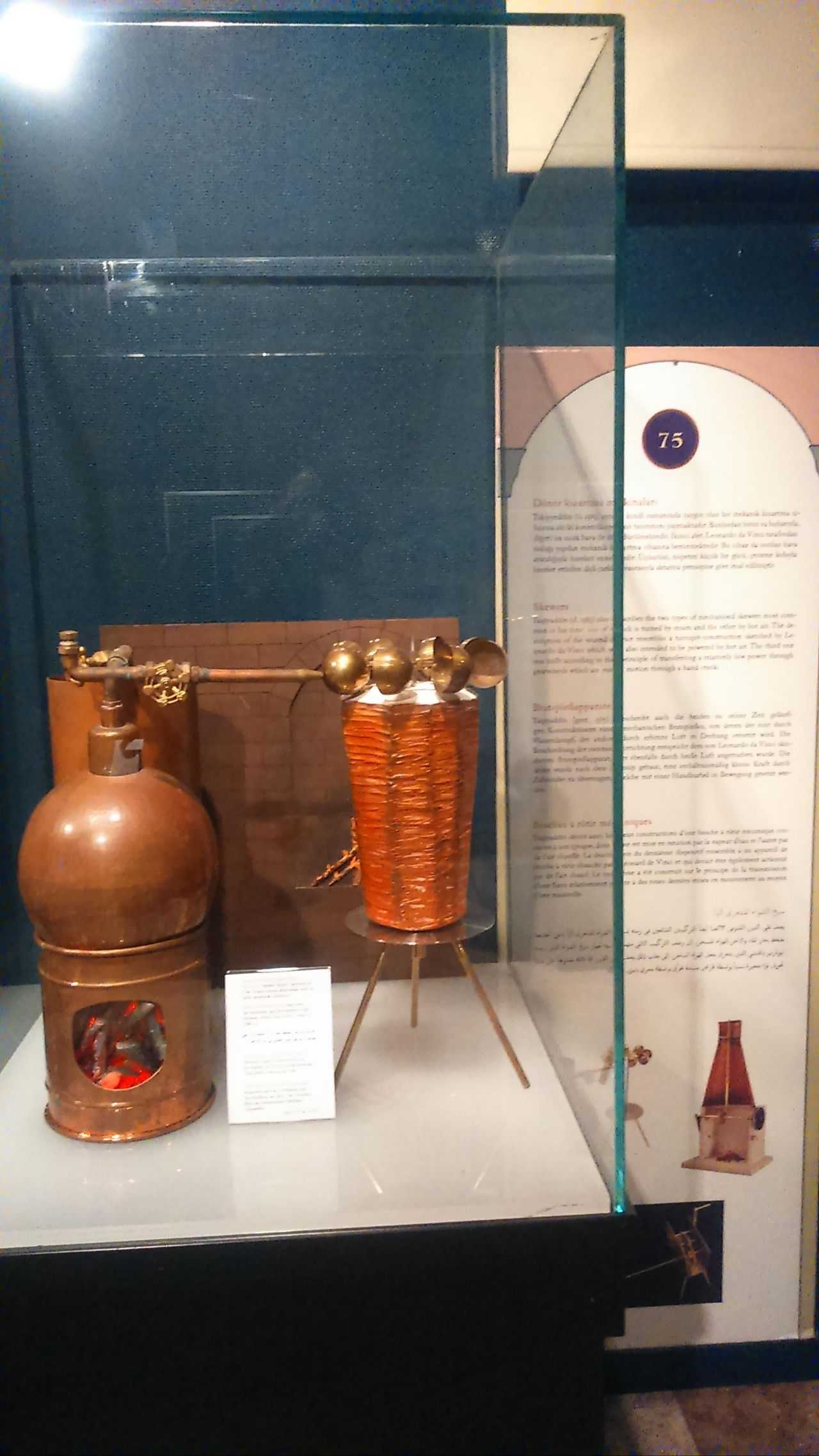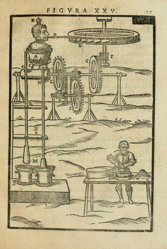 This was made by people in several ways, and one of these is to have at the end of the spit a wheel with vanes, and opposite the wheel place a hollow pitcher made of copper with a closed head and full of water. Let the nozzle of the pitcher be opposite the vanes of the wheel. Kindle fire under the pitcher and steam will issue from its nozzle in a restricted form and it will turn the vane wheel. When the pitcher becomes empty of water bring close to it cold water in a basin and let the nozzle of the pitcher dip into the cold water. The heat will cause all the water in the basin to be attracted into the pitcher and the [the steam] will start rotating the vane wheel again.