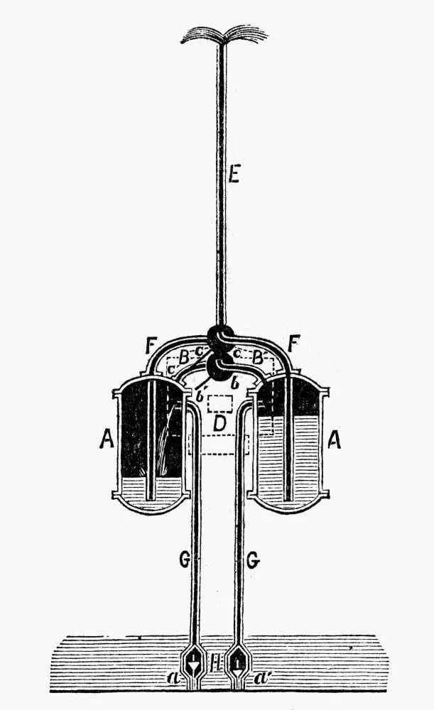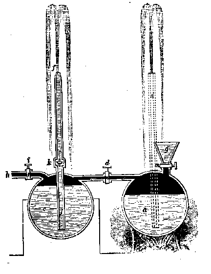 蒸汽从BB’管子进入A罐子上方,罐子里的水被水蒸气压出罐子先后经过F和E管子送到高处,一个A罐子水排空后通过阀门更换另一个罐子,空罐子蒸汽冷却形成负压,就从下方进水口H处把水吸上来,进水口还有止回阀