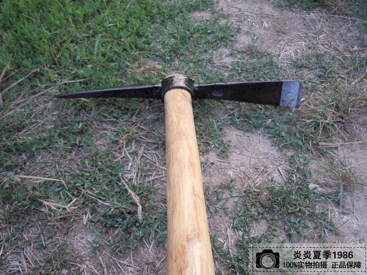 一头尖,一头是刃,沉重厚实,每一侧长度都有30~40厘米长,加起来全长近80公分上下,体格不好的人都抡不动——这玩意儿叫“洋镐”;过去我们也有类似的农具。