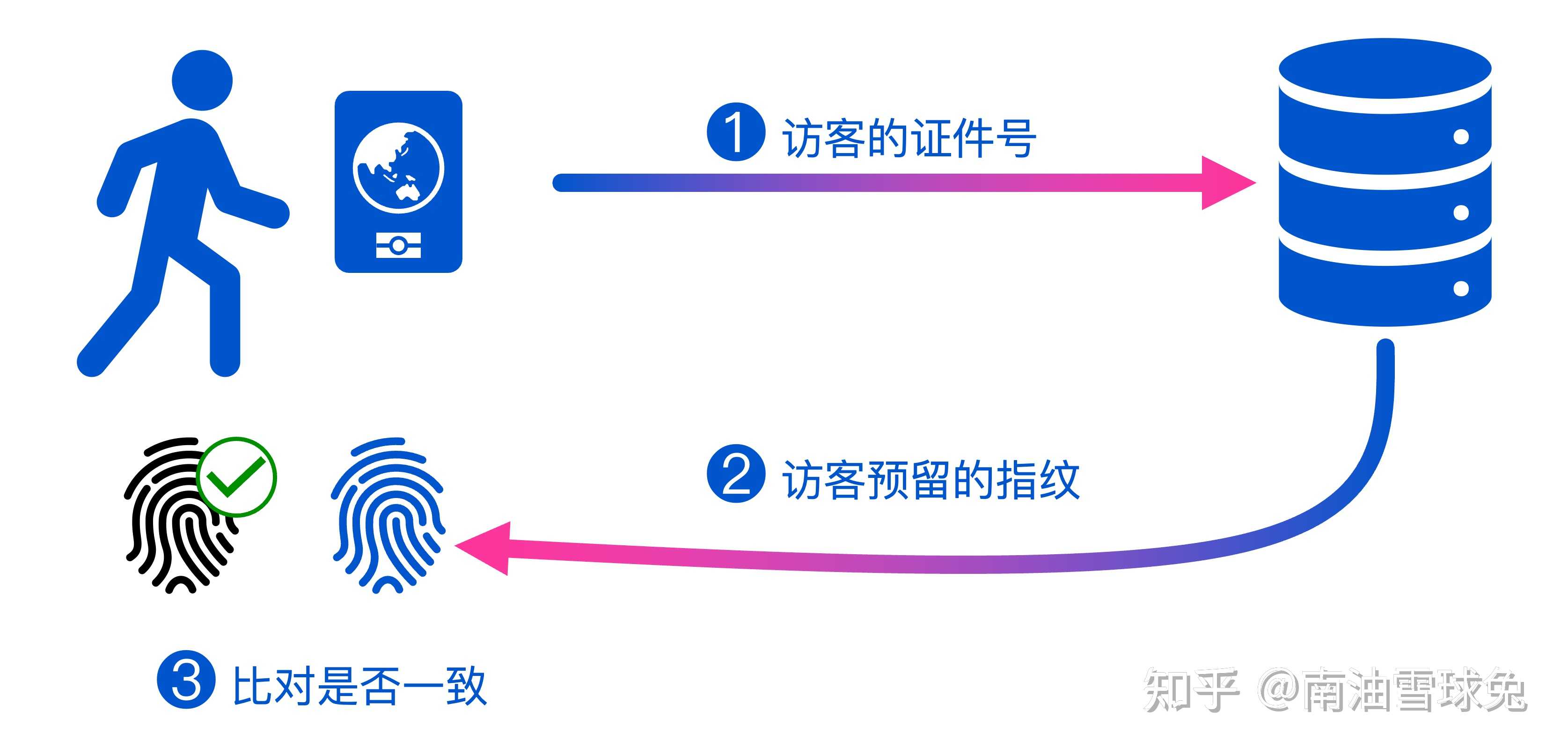 闸机读取你的证件号 > 摄像头识别你的面部信息 > 向服务器请求指纹数据(1) > 服务器返回预留的指纹信息(2) > 校验你的指纹(3) > 成功入境。
