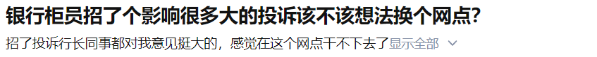 excaliburcai: 作为曾经的银行人,有些惊讶这个题主的状态。我是应届校招进的省城某国有五大行主城区支行的。当年15个新人一起分配到支行,头一年走了7个。第一个月就走了好几个,剩下的,女生都被骂哭过。男生肯定也都被顾客骂过。柜员就是这么个现状,忍不了早走了,忍得了的,接下来也会因事业发展而零零散散走掉部分。剩下的8个人中包括我,在三年内,基本都转成了大堂经理、理财经理、对公经理或者直接去支行本部坐楼上的办公室职务,再不济也是综合柜员转对公柜。有海外留学背景、研究生学历以及浙大之类优秀的985、211高校背景的都是优先就调岗了的。我们也不是没有坐柜很多年,十年、十几年都还在柜台的,但大部分都是老人了。都是0几年入行的。至于年纪再大的,就不可能再让你在一线呆着了,怕你出错,毕竟一线需要的精力和集中力还是年轻人更适合。至于,年纪轻轻又迟迟晋升不了的,就会在之后几年内陆续离职找其他出路。所以,像题主这种研究生,又爱琢磨各种刁钻的职业及生活问题的而且还怎么都升不了职转不了岗的,甚至也不愿意辞职换路线另谋发展的。说句我心里的实话,在看来,的确算是一支“奇葩”了。这如果在我们行,我大概能将她和某些老人“对号入座”,人物画像都大概出来了。因为,这个题主给我的感觉是,她的人生不知怎么就被她过得很难。可明明大家都走在同一条路上。令我有些哭笑不得。 👍🏽2 💭四川 🕐2024-12-23 21:35:56
