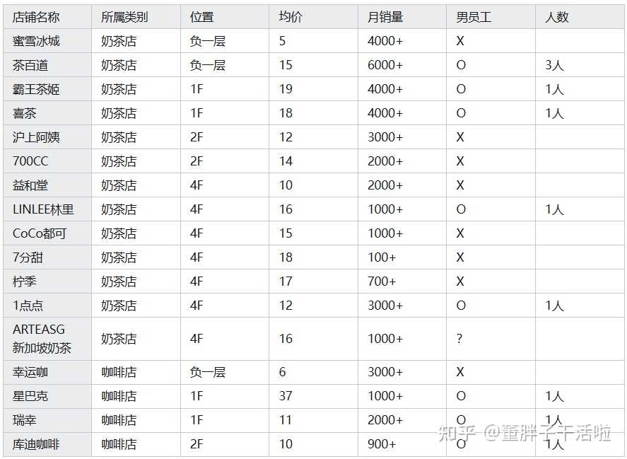 我将统计的奶茶店、咖啡店饮品店分为两类,一是有男员工的店铺,二是无男员工的店铺。O为有,X为无